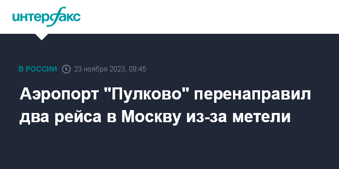 Москва. 23 ноября. INTERFAX.RU - Петербургский аэропорт "Пулково" из-за плохой погоды перенаправил рейсы, следовавшие из Уфы и Тюмени, на запасной аэродром в "Шереметьево", сообщили "Интерфаксу" в пресс-службе ООО "Воздушные ворота северной столицы" (ВВСС, оператор петербургского аэропорта "Пулково").