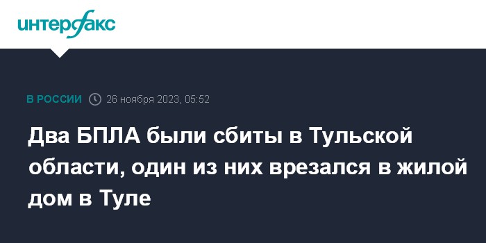 "В ночь на 26 ноября над территорией Тульской области была пресечена атака двух беспилотных летательных аппаратов. Оба были сбиты средствами ПВО Министерства обороны РФ. Один из них, потеряв управление, врезался в многоквартирный жилой дом в Туле", - говорится в сообщении главы региона.