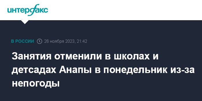 Москва. 26 ноября. INTERFAX.RU - Власти Анапы отменили в понедельник занятия в детсадах, школах и учреждениях допобразования города из-за непогоды, сообщает мэрия Анапы в своем телеграм-канале в воскресенье.