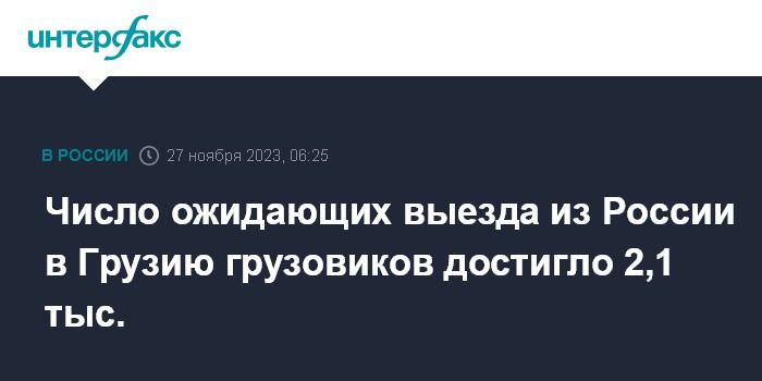 Москва. 27 ноября. INTERFAX.RU - Число грузовых автомобилей, ожидающих со стороны РФ возобновления движения по закрытой из-за непогоды Военно-Грузинской дороге, достигло 2,1 тыс. машин, сообщается на сайте центра организации дорожного движения Северной Осетии.