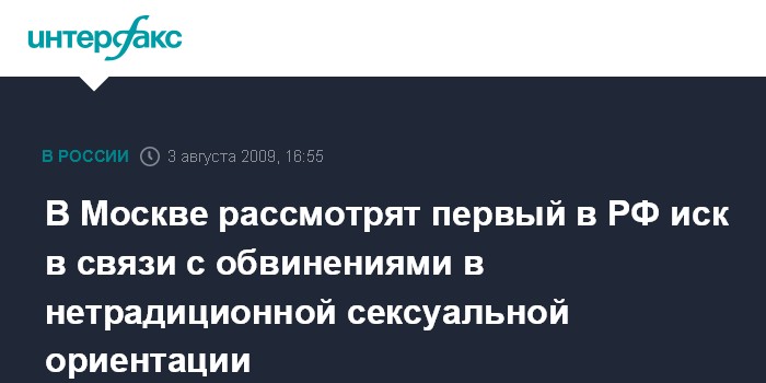 Москва. 3 августа. INTERFAX.RU - В Савеловском суде Москвы впервые в России будет рассмотрено гражданское дело о защите чести и достоинства, в связи с распространением информации о нетрадиционной сексуальной ориентации истца. "В суде 10 августа состоится предварительное слушание по иску", - сообщил "Интерфаксу" адвокат истца Александр Зорин.