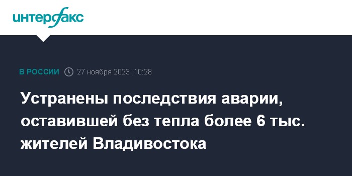 В понедельник, 27 ноября, около полудня по местному времени (5:00 мск) произошла авария на магистральном трубопроводе теплоснабжения, в результате которой более 6 тыс. жителей Владивостока остались без тепла и горячего водоснабжения.