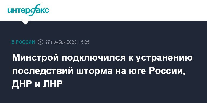 Москва. 27 ноября. INTERFAX.RU - Министерство строительства и ЖКХ РФ организовало работу по ликвидации последствий стихии в южных регионах страны, Донецкой и Луганской народных республиках (ДНР и ЛНР), сообщает пресс-служба министерства.