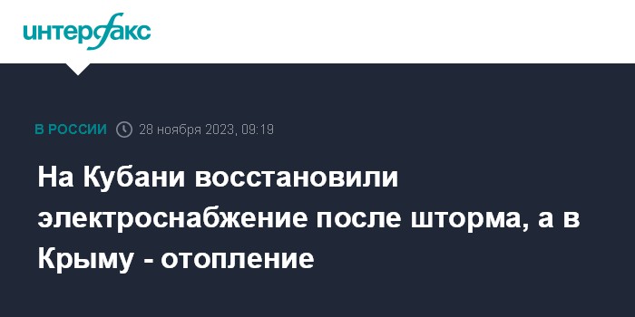 Москва. 28 ноября. INTERFAX.RU - В Краснодарском крае полностью восстановлено нарушенное непогодой электроснабжение, а в Крыму - теплоснабжение, сообщило федеральное МЧС.
