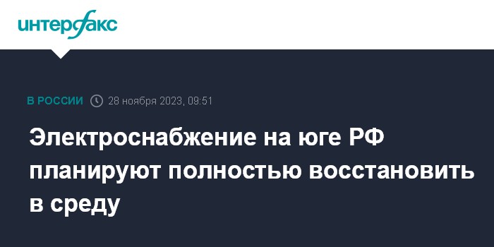 "Полностью восстановлено электроснабжение в Краснодарском крае, республике Дагестан и в Ростовской области", - сказал Шульгинов.