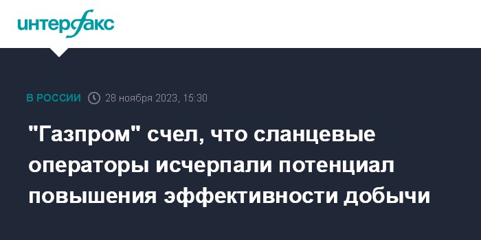 Москва. 28 ноября. INTERFAX.RU - Операторы добычи сланцевого газа исчерпали потенциал повышения эффективности производства и рост издержек скажется на производимом из него сжиженном природном газе, отмечает "Газпром".