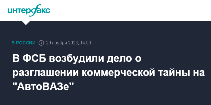 Москва. 29 ноября. INTERFAX.RU - Следственный отдел УФСБ России по Самарской области возбудил уголовное дело о разглашении коммерческой тайны в отношении сотрудницы АО "АвтоВАЗ", сообщила пресс-служба ведомства.