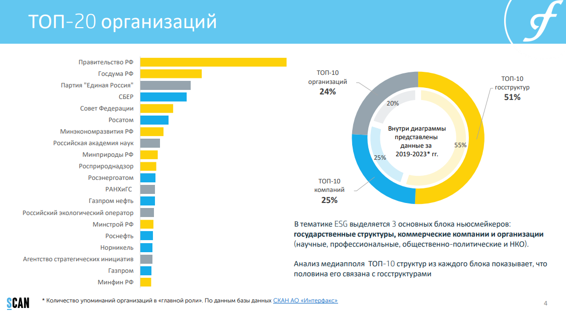 В тематике ESG выделяется три основных блока ньюсмейкеров: государственные структуры, коммерческие компании и организации (научные, профессиональные, общественно-политические и НКО).
