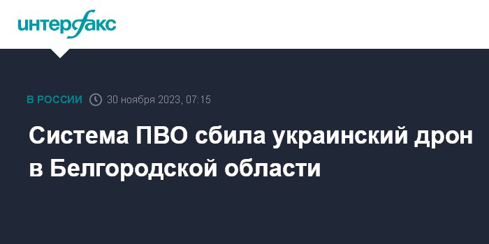 Москва. 30 ноября. INTERFAX.RU - Российские военные заявили об уничтожении украинского беспилотника самолетного типа в ночь на четверг в Белгородской области.