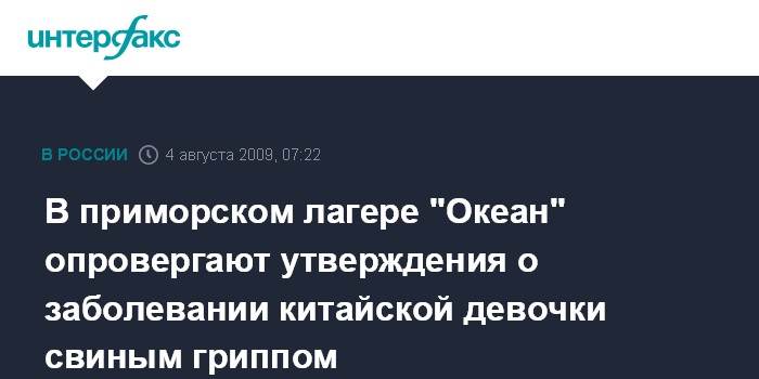 Владивосток. 4 августа. ИНТЕРФАКС-ДАЛЬНИЙ ВОСТОК - Администрация Всероссийского детского центра (ВДЦ) "Океан" в Приморье опровергает заявление главного санитарного врача РФ Геннадия Онищенко о том, что в лагере был выявлен случай заражения вирусом H1N1.