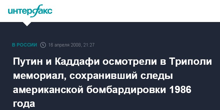 Путин и Каддафи осмотрели в Триполи мемориал, сохранивший следы американской бомбардировки 1986 года