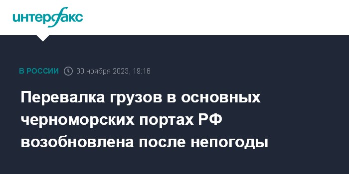 Москва. 30 ноября. INTERFAX.RU - Некоторое улучшение погоды позволило в 16.00 в четверг возобновить швартовные операции и перевалку грузов в основных черноморских портах РФ, сообщило Федеральное агентство морского и речного транспорта (Росморречфлот) со ссылкой на администрацию морских портов Черного моря.