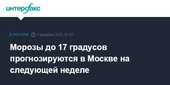 Москва. 1 декабря. INTERFAX.RU - Январские морозы прогнозируются в Москве на следующей неделе, температура днем не будет подниматься выше минус 10 - минус 15 градусов, ночные температуры будут опускаться до минус 17, сообщил "Интерфаксу" научный руководитель Гидрометцентра России Роман Вильфанд.