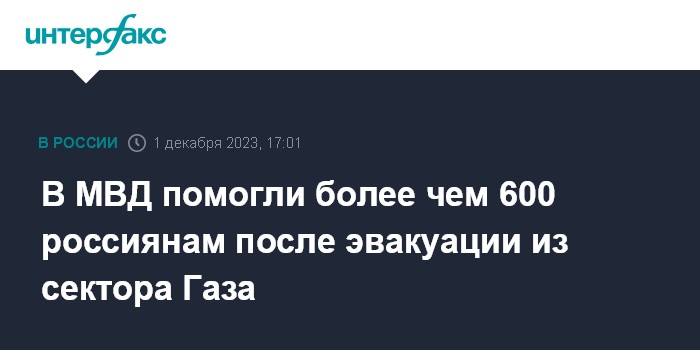 Москва. 1 декабря. INTERFAX.RU - Сотрудники МВД казали помощь более 600 гражданам, эвакуированным из сектора Газа, в том числе по восстановлению документов и получению правовых статусов, сообщила представитель министерства Ирина Волк.