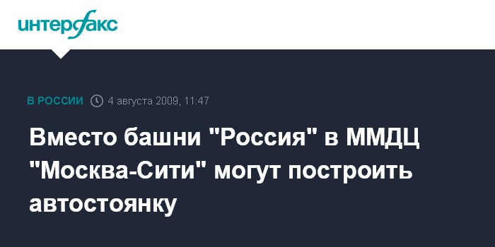Москва. 4 августа. INTERFAX.RU - Вместо самого высокого небоскреба в Европе - башни "Россия", инвестором которого должен был выступить Шалва Чигиринский, в ММДЦ "Москва-Сити" может быть построена временная автостоянка на 530 машиномест. Об этом во вторник сообщает газета "Коммерсант". Инвестором проекта, по данным газеты, выступит ОАО "Сити", принадлежащее "Базэлу" Олега Дерипаски и другим близким этому бизнесмену структурам.