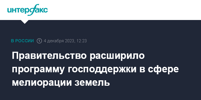 Москва. 4 декабря. INTERFAX.RU - Правительство расширило программу господдержки в области мелиорации для вовлечения в оборот новых земель сельхозназначения, сообщает сайт правительства.