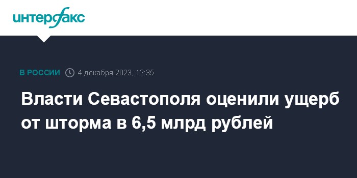 Москва. 4 декабря. INTERFAX.RU - Ущерб от шторма, накрывшего Севастополь неделю назад, предварительно составляет около 6,5 млрд рублей, сообщил губернатор Михаил Развожаев на аппаратном совещании правительства города.