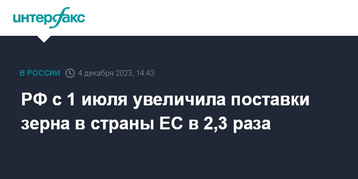 РФ с 1 июля увеличила поставки зерна в страны ЕС в 2,3 раза