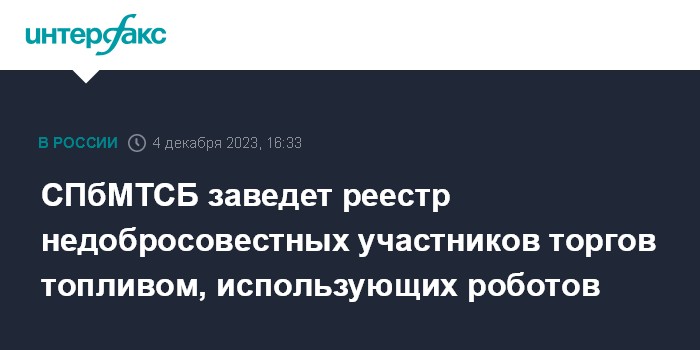 Москва. 4 декабря. INTERFAX.RU - Санкт-Петербургская международная товарно-сырьевая биржа (СПбМТСБ) вводит новую методику выявления роботов при торгах нефтепродуктами, а также начинает ведение реестра участников торгов, применяющих недобросовестные практики в виде роботов.