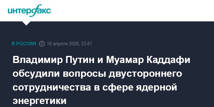 Триполи. 16 апреля. ИНТЕРФАКС - Президент России Владимир Путин и ливийский лидер Муамар Каддафи обсудили перспективы российско-ливийского сотрудничества в области ядерной энергетики и проблематику нераспространения ядерного оружия.