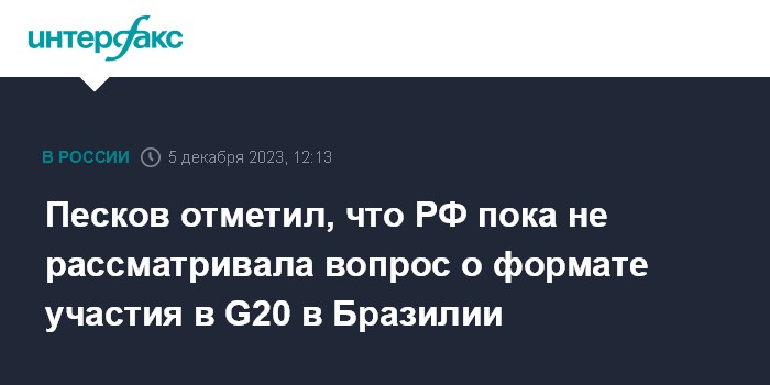 Песков отметил, что РФ пока не рассматривала вопрос о формате участия в G20 в Бразилии