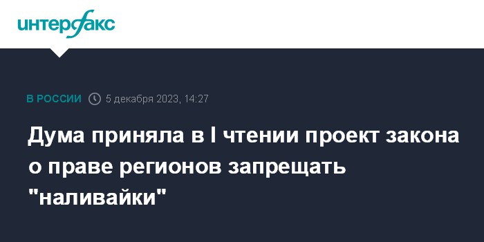 Москва. 5 декабря. INTERFAX.RU - Госдума во вторник приняла в первом чтении проект закона о праве субъектов РФ устанавливать запрет на розничную продажу пива, медовухи в многоквартирных домах.