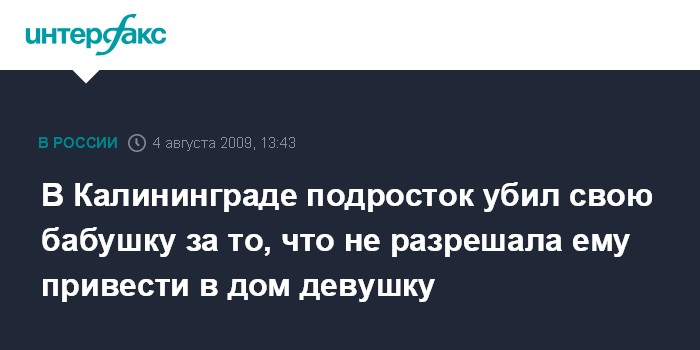 Калининград. 4 августа. INTERFAX.RU - В Калининграде на шесть лет воспитательной колонии осужден несовершеннолетний, который убил свою бабушку за то, что она не разрешила ему привести в дом девушку для сожительства, сообщает пресс-служба региональной прокуратуры.