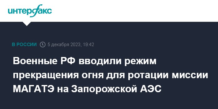 Москва. 5 декабря. INTERFAX.RU - Российские военнослужащие сообщили, что обеспечили проведение очередной ротации наблюдателей миссии МАГАТЭ на Запорожской АЭС, вводился режим прекращения огня.