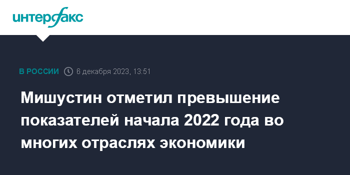 Москва. 6 декабря. INTERFAX.RU - Российская экономика, несмотря на западные санкции, по ряду направлений уже превысила показатели начала 2022 года, заявил в лектории общества "Знание" премьер-министр Михаил Мишустин.