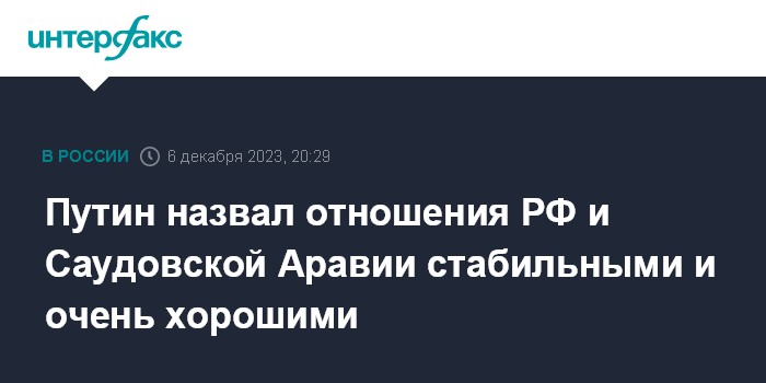 Москва. 6 декабря. INTERFAX.RU - Отношения между Россией и Саудовской Аравией можно охарактеризовать как очень хорошие и стабильные, заявил президент РФ Владимир Путин.