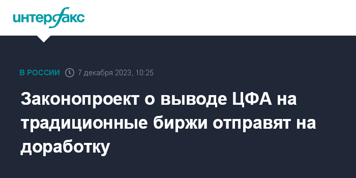 Москва. 7 декабря. INTERFAX.RU - Комитет Госдумы по финансовому рынку планирует отправить на доработку законопроект, который разрешает выводить цифровые финансовые активы (ЦФА) для торговли в традиционной торгово-расчетной инфраструктуре фондового рынка, рассказал "Интерфаксу" источник накануне заседания комитета.