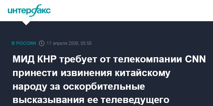 Пекин. 17 апреля. ИНТЕРФАКС-КИТАЙ - Министерство иностранных дел КНР в среду вечером потребовало от американского телеканала CNN и ее телеведущего Джека Кафферти принести извинения китайскому народу за оскорбительные высказывания в его адрес.