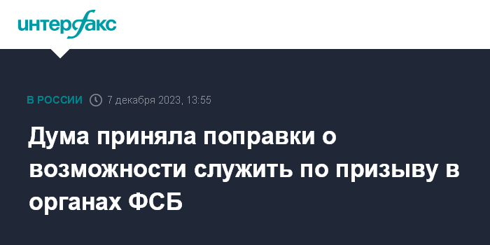 Москва. 7 декабря. INTERFAX.RU - Госдума в четверг приняла поправки, предусматривающие службу по призыву в органах Федеральной службы безопасности, в том числе в погранвойсках ФСБ России.