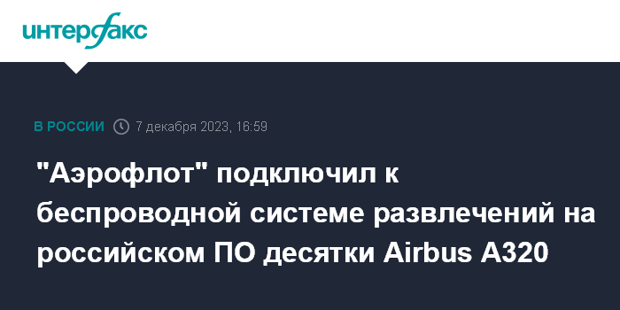 Москва. 7 декабря. INTERFAX.RU - "Аэрофлот" подключил к беспроводной системе развлечений на отечественном программном обеспечении более 65 самолетов Airbus A320ceо, сообщила компания.