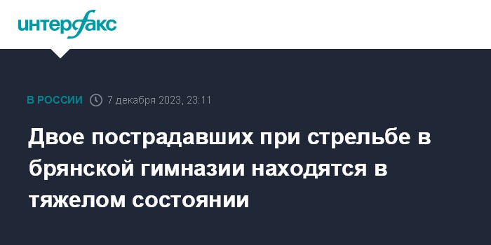 Москва. 7 декабря. INTERFAX.RU - Состояние двоих из пяти детей, пострадавших в результате стрельбы в брянской гимназии, оценивается как стабильно тяжелое, сообщил губернатор Брянской области Александр Богомаз в своем телеграм-канале в четверг.
