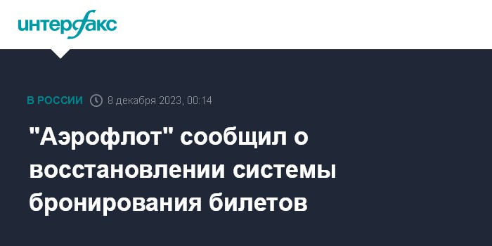 Москва. 8 декабря. INTERFAX.RU - "Аэрофлот" сообщил о восстановлении работы системы бронирования билетов "Леонардо".