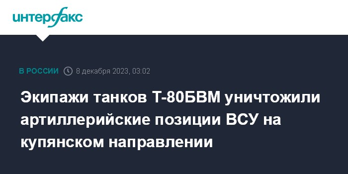 Москва. 8 декабря. INTERFAX.RU - Министерство обороны РФ заявило, что модернизированные танки Т-80БВМ Западного военного округа уничтожили артиллерийские позиции вооруженных сил Украины (ВСУ) на купянском направлении.