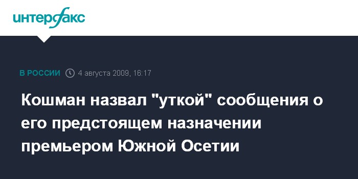 Москва. 4 августа. NTERFAX.RU - Глава Ассоциации строителей России Николай Кошман опроверг распространенную некоторыми СМИ информацию о своем возможном назначении на пост главы правительства Южной Осетии. "Похоже, что это какая-то "утка", - заявил он "Интерфаксу" во вторник, комментируя информацию некоторых российских СМИ о том, что Кошман рассматривается в качестве кандидата на освободившийся пост премьер-министра Южной Осетии.
