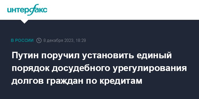 Москва. 8 декабря. INTERFAX.RU - Президент Владимир Путин поручил правительству вместе с Банком России установить единый обязательный порядок досудебного урегулирования споров между кредиторами и гражданами по кредитам (займам), внести соответствующие изменения в законодательство, говорится на сайте Кремля.
