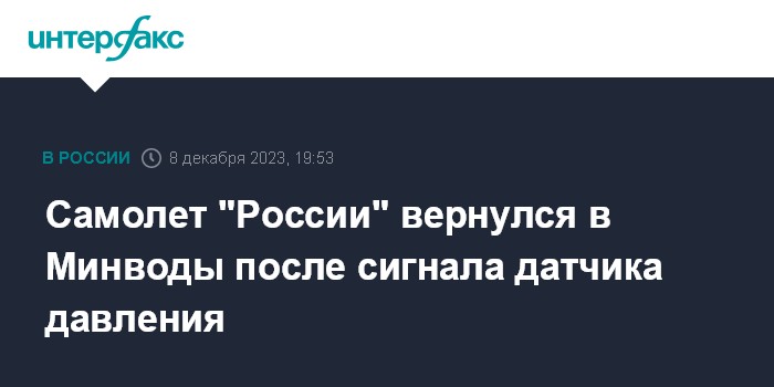 Москва. 8 декабря. INTERFAX.RU - Самолет авиакомпании "Россия" рейса Минеральные Воды - Санкт-Петербург успешно приземлился в аэропорту вылета после срабатывания датчика давления.