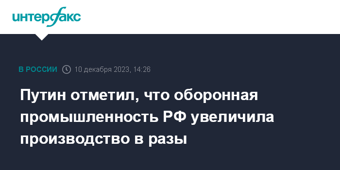 Москва. 10 декабря. INTERFAX.RU - Президент РФ Владимир Путин заявил, что оборонная промышленность страны в разы увеличила производство военной продукции.