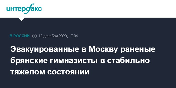 Москва. 10 декабря. INTERFAX.RU - Двое эвакуированных в Москву подростков, пострадавших в результате стрельбы в гимназии в Брянске и которых ранее прооперировали, находятся в стабильно тяжелом состоянии, сообщили в воскресенье в Минздраве РФ.