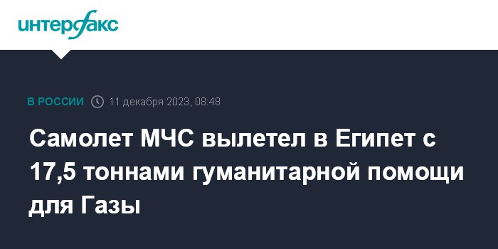 Москва. 11 декабря. INTERFAX.RU - Ил-76 российского МЧС вылетел в египетский город Эль-Ариш с очередной партией гуманитарной помощи для населения сектора Газа, сообщила пресс-служба министерства.