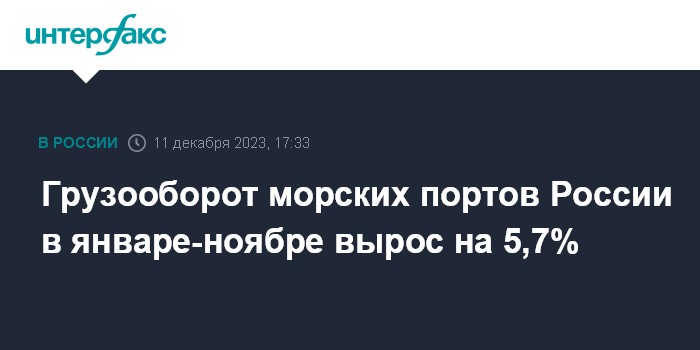 Москва. 11 декабря. INTERFAX.RU - Грузооборот морских портов России за январь-ноябрь 2023 года увеличился на 5,7% по сравнению с аналогичным периодом прошлого года и составил 811,9 млн тонн, сообщает Росморречфлот.