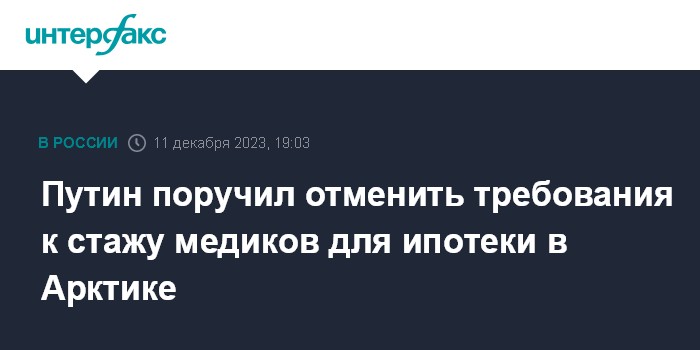 Москва. 11 декабря. INTERFAX.RU - Президент России Владимир Путин поручил правительству снять требования к стажу работы медиков и педагогов для получения ипотеки в Арктической зоне.