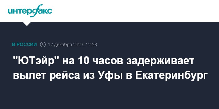 Москва. 12 декабря. INTERFAX.RU - Рейс авиакомпании "ЮТэйр" из Уфы в Екатеринбург задерживается на 10 часов по технической причине, сообщила пресс-служба Приволжской транспортной прокуратуры.