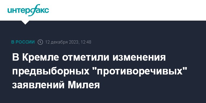 Москва. 12 декабря. INTERFAX.RU - В Кремле знают о "противоречивых заявлениях из Буэнос-Айреса", которые новый президент Хавьер Милей делал до выборов, сейчас эти заявления "корректируются", отметил на брифинге пресс-секретарь президента России Дмитрий Песков.