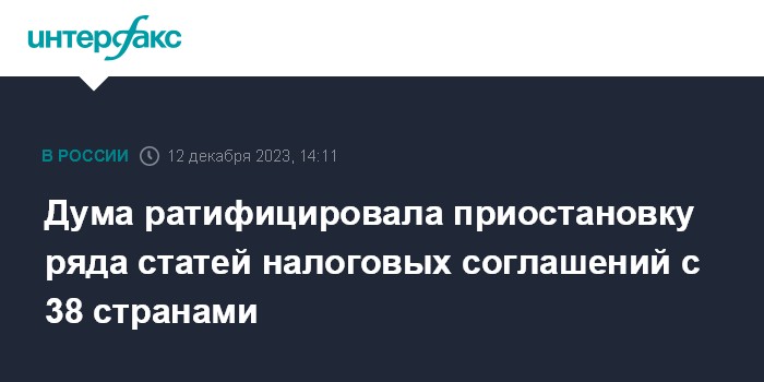 Москва. 12 декабря. INTERFAX.RU - Госдума ратифицировала приостановление действия ряда статей налоговых соглашений с зарубежными странами, соответствующий указ президент РФ подписал 8 августа, он вступил в силу со дня опубликования, но для соблюдения правовых процедур необходима его ратификация.