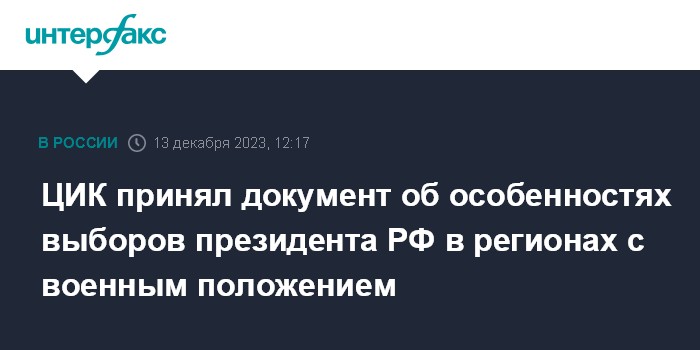 Москва. 13 декабря. INTERFAX.RU - Центризбирком России на заседании принял положение об особенностях подготовки и проведения выборов президента России в период действия военного положения на части территории страны.