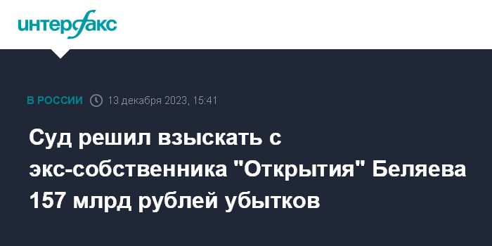 Москва. 13 декабря. INTERFAX.RU - Арбитражный суд Москвы в среду по иску банка "Траст" решил взыскать с основателя финансовой группы "Открытие" Вадима Беляева около 156,6 млрд рублей убытков, сообщили "Интерфаксу" в пресс-службе банка.